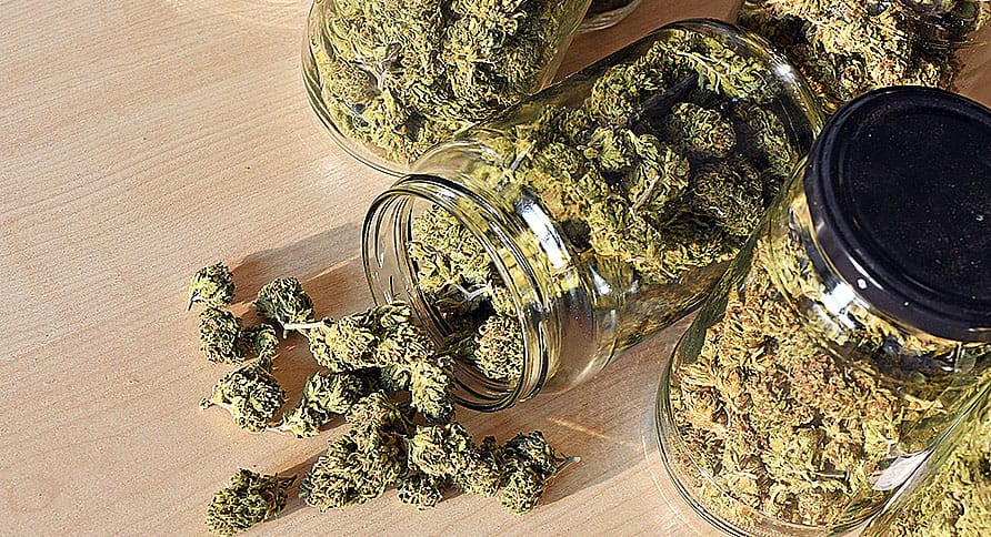 Dry and trimmed cannabis buds stored in a glas jars.