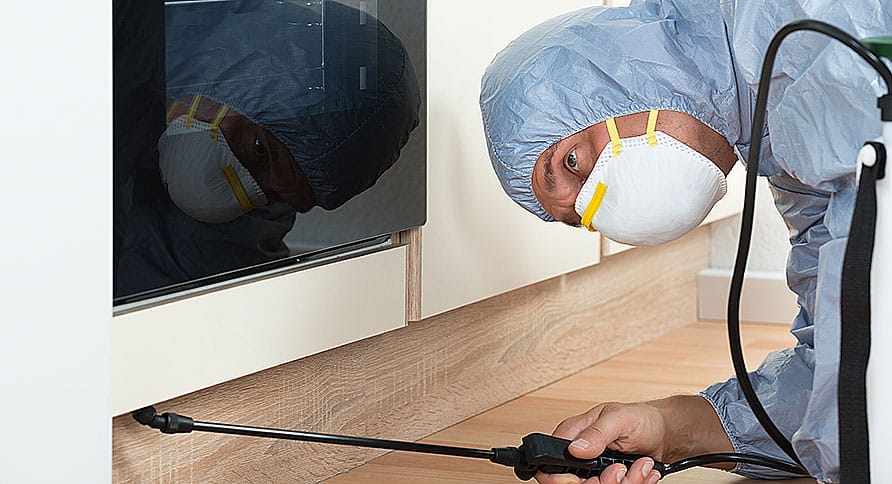 Exterminator Spraying Pesticide On Wooden Cabinet