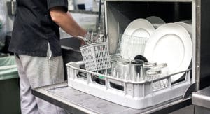 Kitchen hand with an open dishwasher
